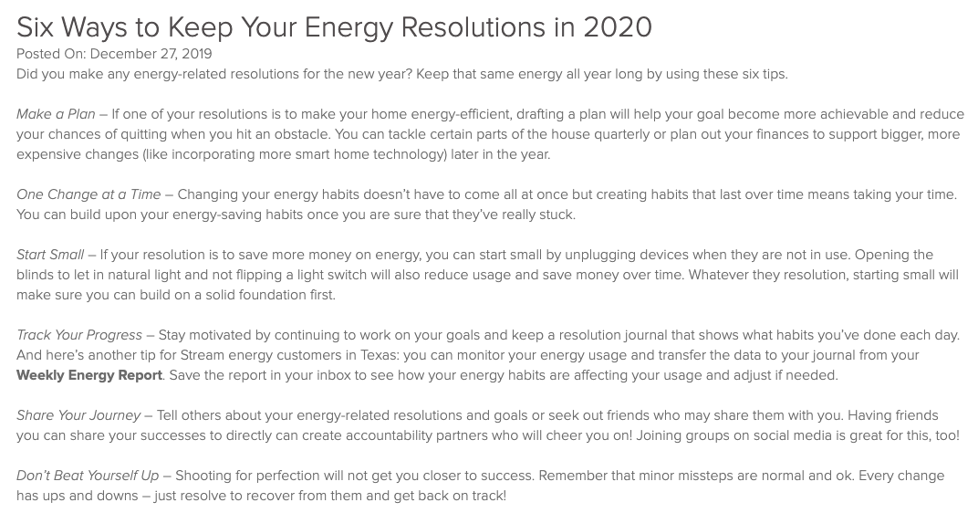 Stream Energy’s short-and-sweet content provides its audience with sound advice in quick, easy-to-digest posts. “Six Ways to Keep Your Energy Resolutions in 2020” is an example of timely content marketing that’s informative and provides value to readers that they can apply to their lives right away. This post gives readers ideas to help them keep their energy-related New Year’s resolutions, and it even ties one tip to the Weekly Energy Report, one of the tools Stream Energy makes available to its customers. Doing so allows Stream Energy to help its customers make the most of what it offers while also helping them achieve the goals they’ve set for themselves.