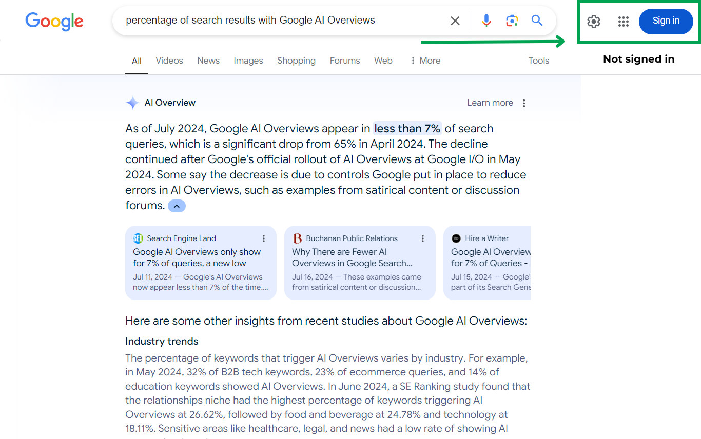 This development suggests that Google is expanding the reach of its AI-generated content in search results. However, it’s important to note that the prevalence of AIOs in search results has fluctuated. A study from June 2024 found that only 8.71% of searches resulted in AI Overviews, a significant decrease from earlier observations.